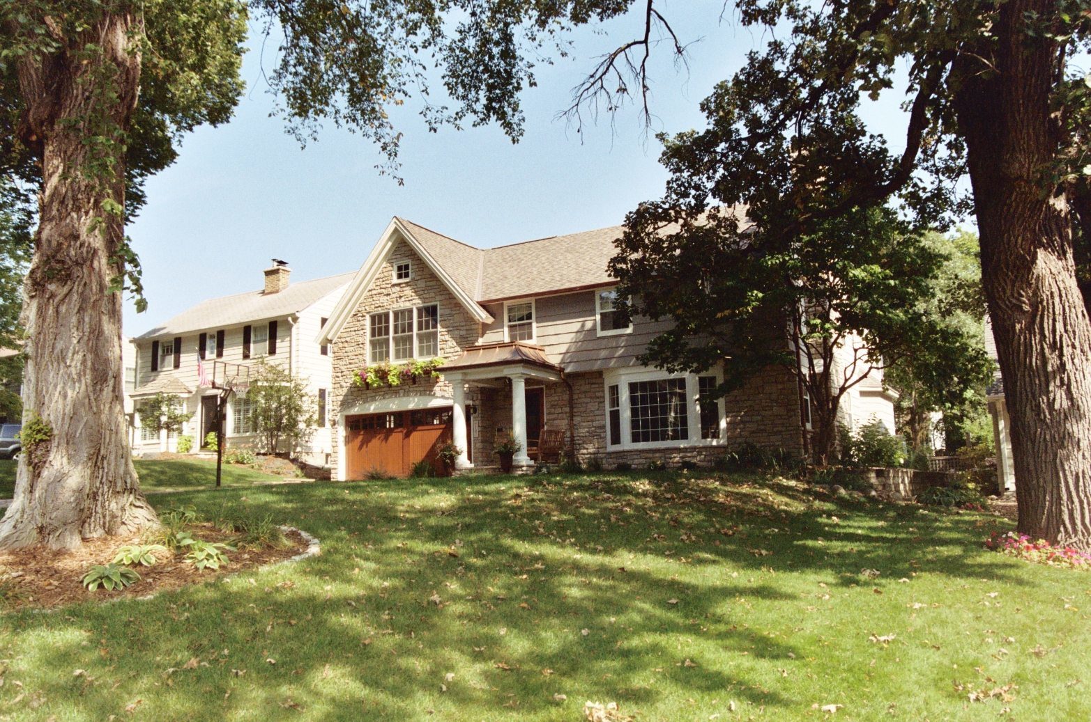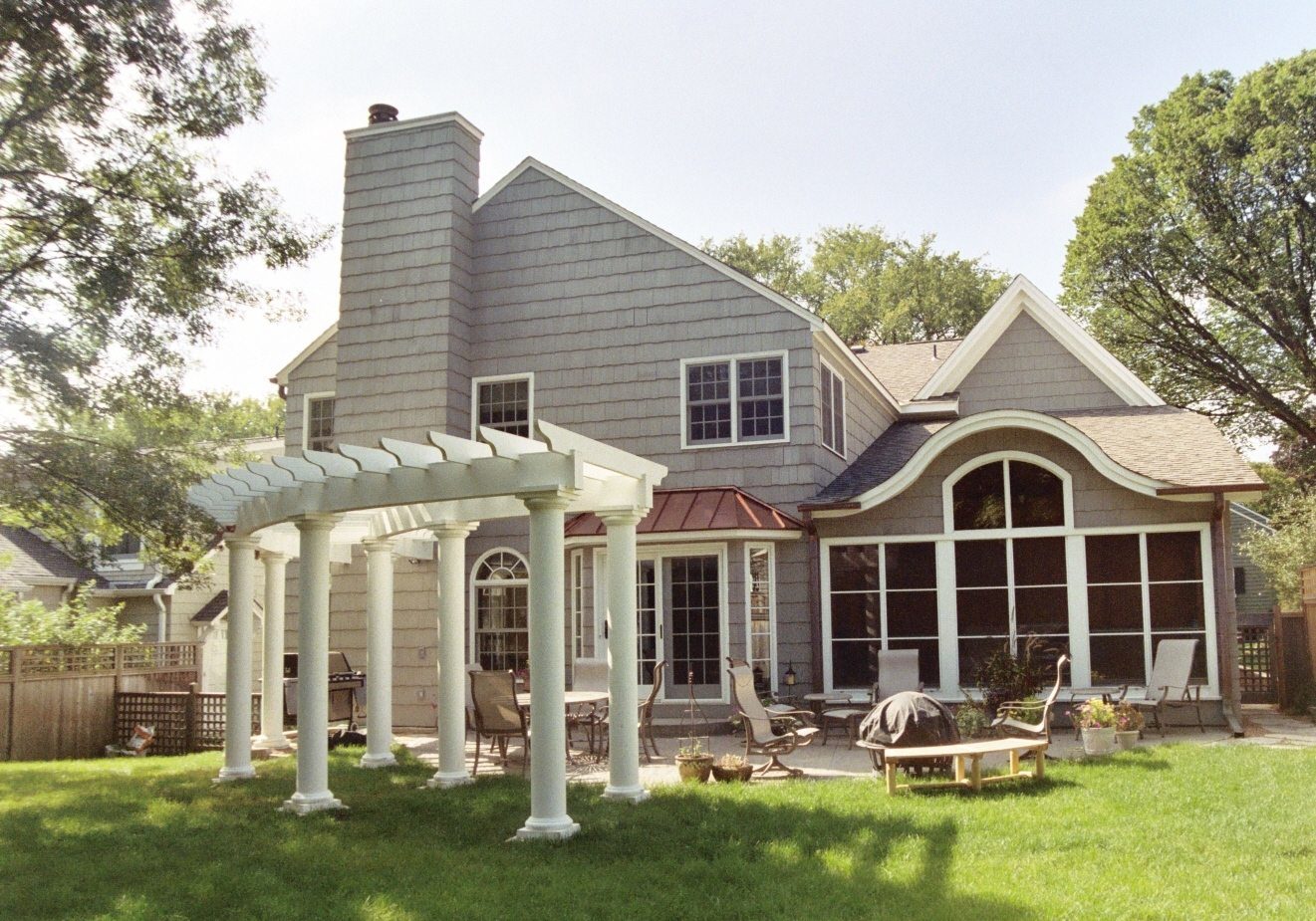 This impressive addition/renovation was designed to meet the needs of an active family while enhancing its curb appeal. An additional bedroom, bath and laundry added to the upper level offered new flexibility and space for the family. A new garage, mudroom and three season porch updated the usability of the main level. On the lower level, a home theater with a large storage room below the garage maximized the efficiency of this addition and allowed for a fun new treat for the family and guests. A new stone gable, covered entry, and stone base bring a fresh presence to the front of the home and the backyard was transformed with an elegant terrace with a curved pergola.