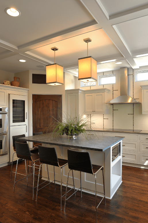 Sitting on a compact city lot in a mature neighborhood of Colonials and Cape Cods, this new two-story, cottage-style home blends beautifully into its surroundings. The home with white panels and shakes atop an earth-toned brick base, replaced an older, single house. But, by sharing a driveway with the home next door and utilizing a modest roofline, it respects its neighbors and the neighborhood in which it resides. The kitchen is awash in soft white and natural light from windows in a variety of locations including above the upper cabinets. The home’s combination living/dining room flows from the kitchen to the front of the home while glass paneled pocket doors open to office/sun room. French doors from both spaces open to a screen porch with a gas fireplace to extend its use from early spring to late fall. The spaces throughout the house are designed for flexibility and the rooms can have multiple uses with doors than can be closed or opened to create greater coziness or to accommodate larger groups.